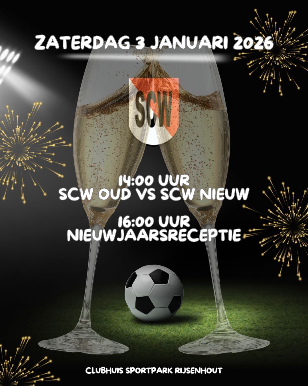 3 Januari houden SCW, TVR en de Blauwe Beugel gezamenlijk de nieuwjaarsreceptie in het nieuwe clubhuis. Voorafgaand is traditioneel de wedstrijd OUD-SCW tegen JONG SCW. Kom gezellig kijken en het glas heffen op het nieuwe jaar.